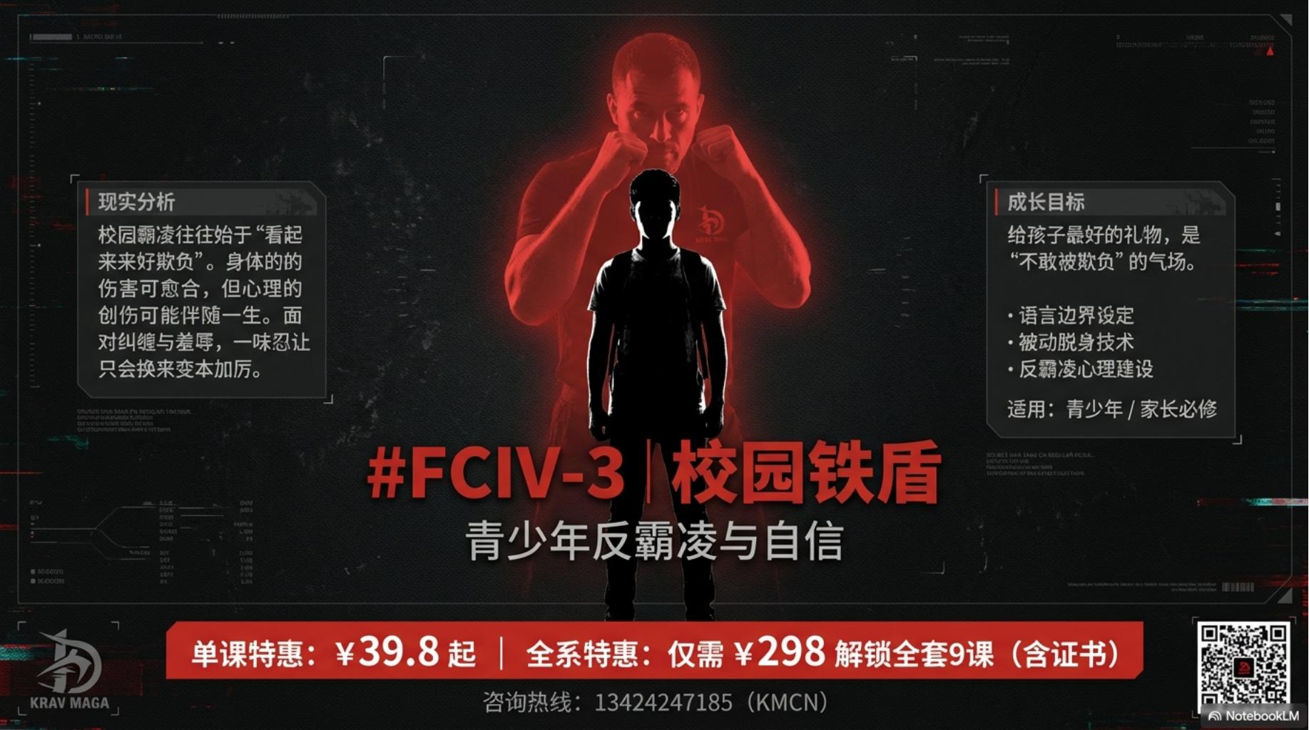 专为青少年设计。重点在于建立自信、语言震慑(De-escalation)以及在不造成严重伤害的前提下挣脱控制(Headlock, 抓衣领)。