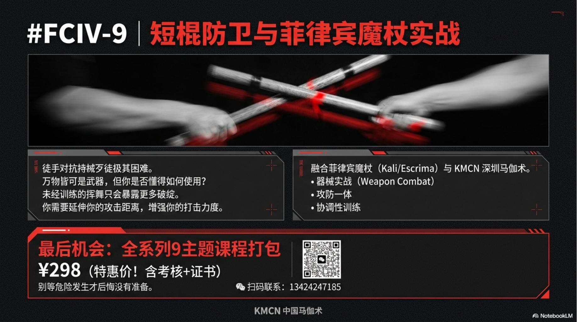 融合菲律宾魔杖 (Kali/Escrima) 与 KMCN深圳马伽术 (Krav Maga) 民用短棍技术。教授如何利用手中的雨伞、登山杖进行有效防身防御,保持安全距离。