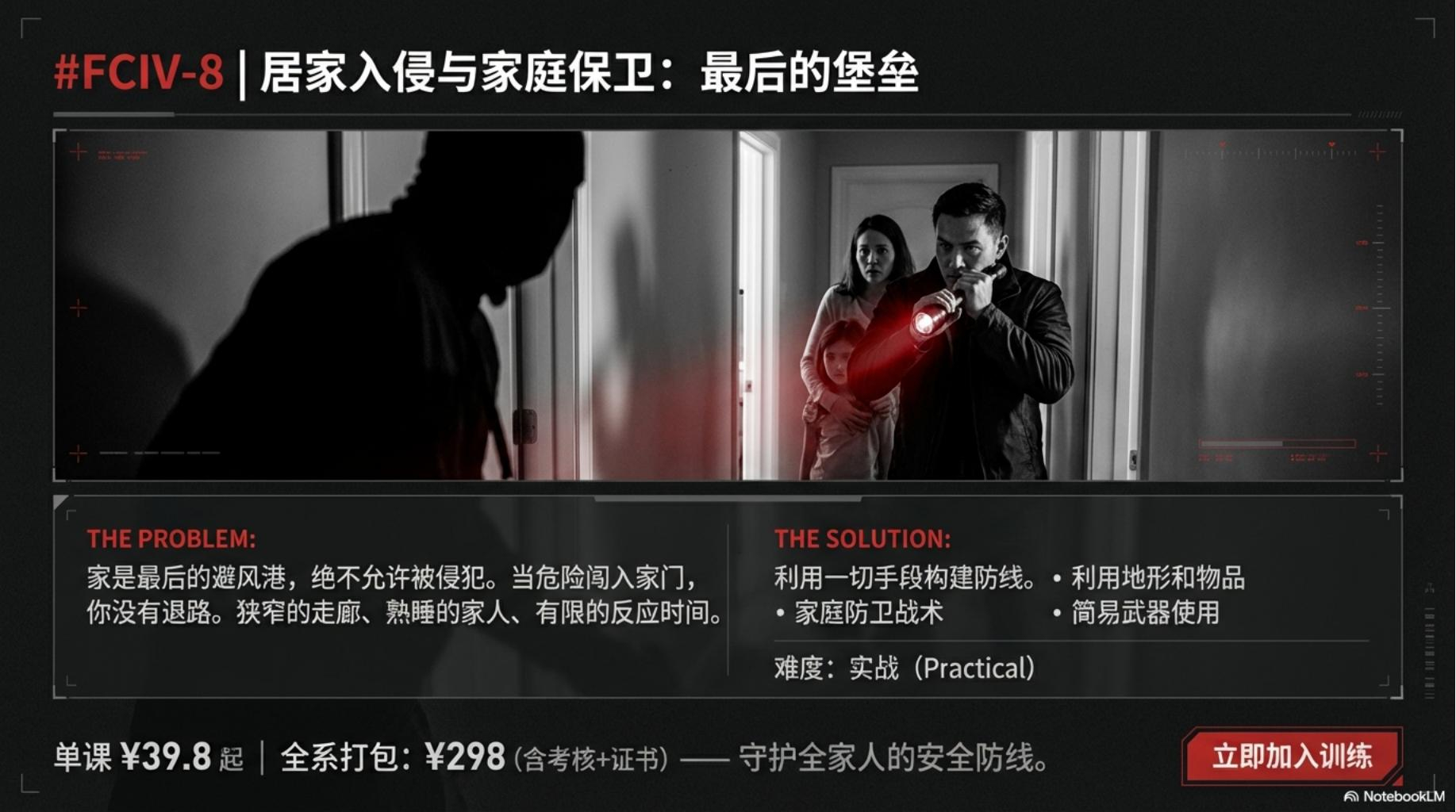 针对入室抢劫、盗窃演变成的暴力。重点在于当被堵在卧室、浴室等死角时,如何利用有限空间和身边物品(台灯、毛巾、门)进行殊死一搏。
